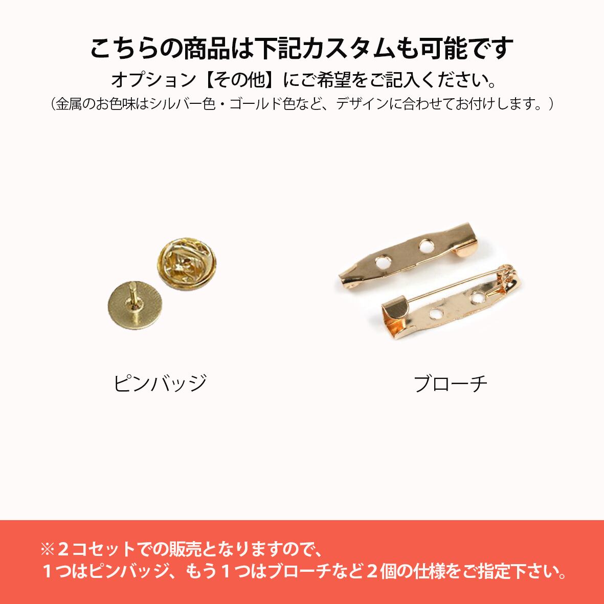 ※ピンバッチやブローチへの変更も承ります。オプション「その他」にご記入ください。