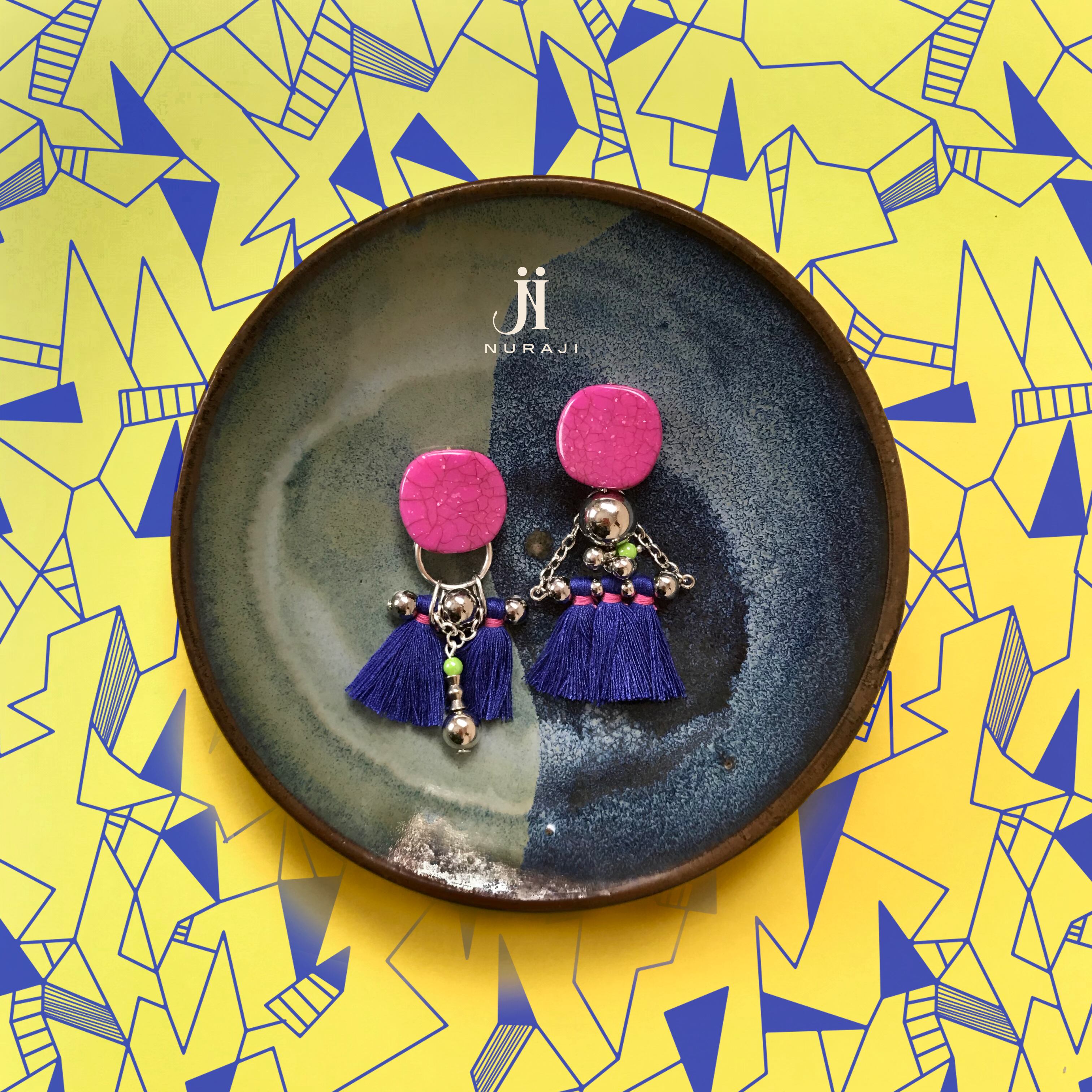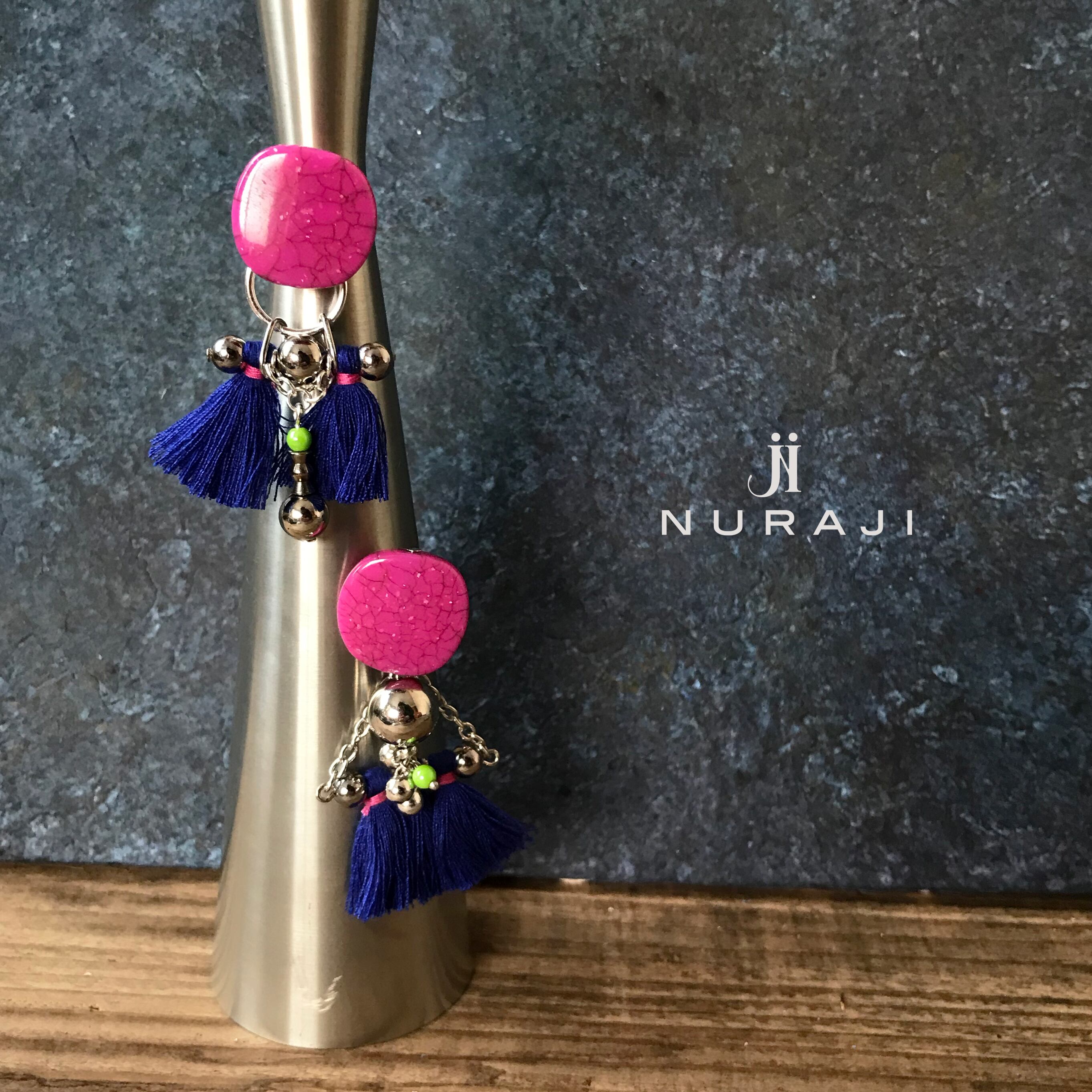 ビビットピンクのクラックビーズとブルーのフリンジ。