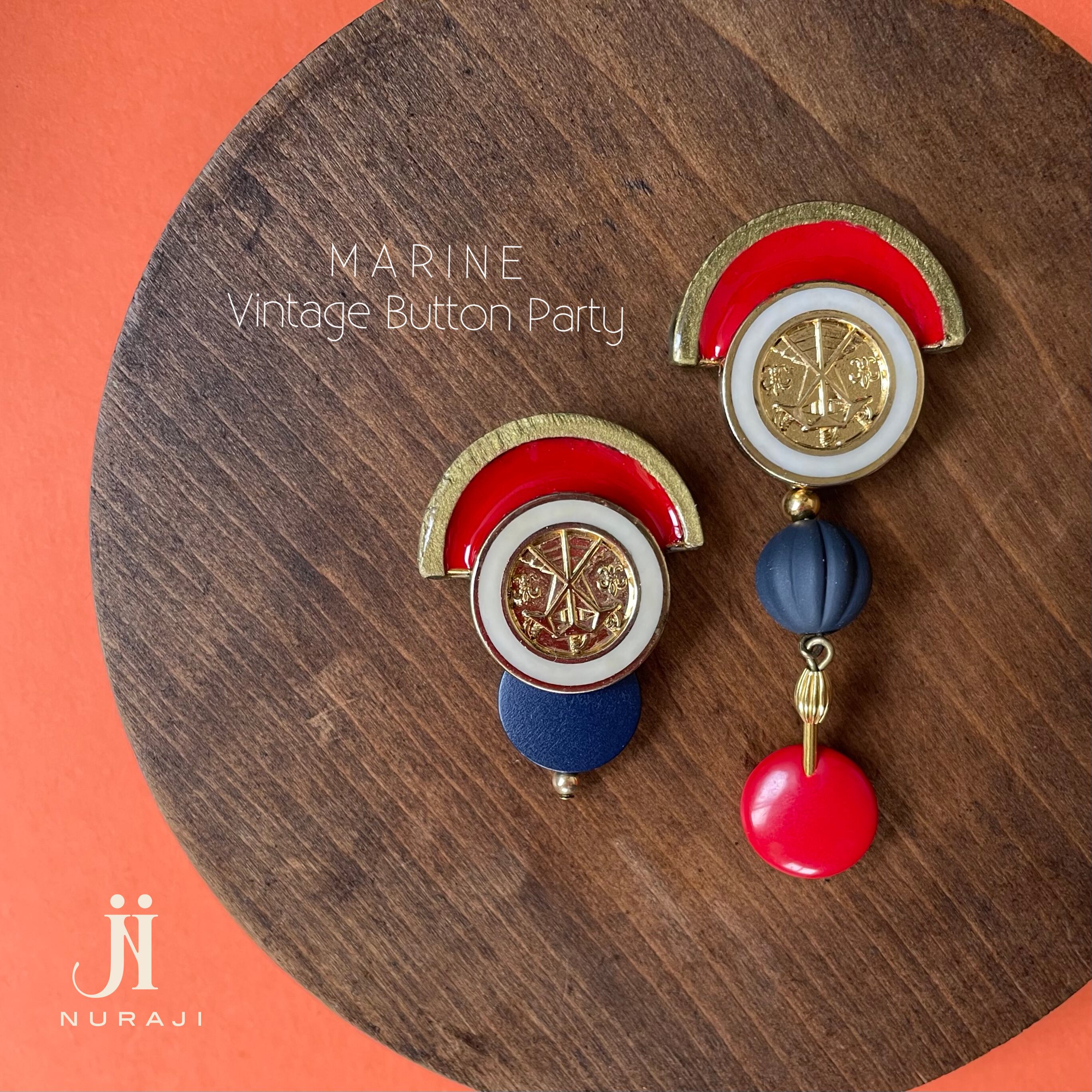 紋章ボタンと彫刻ウッドのエナメルが昔のピンバッチのような雰囲気に。