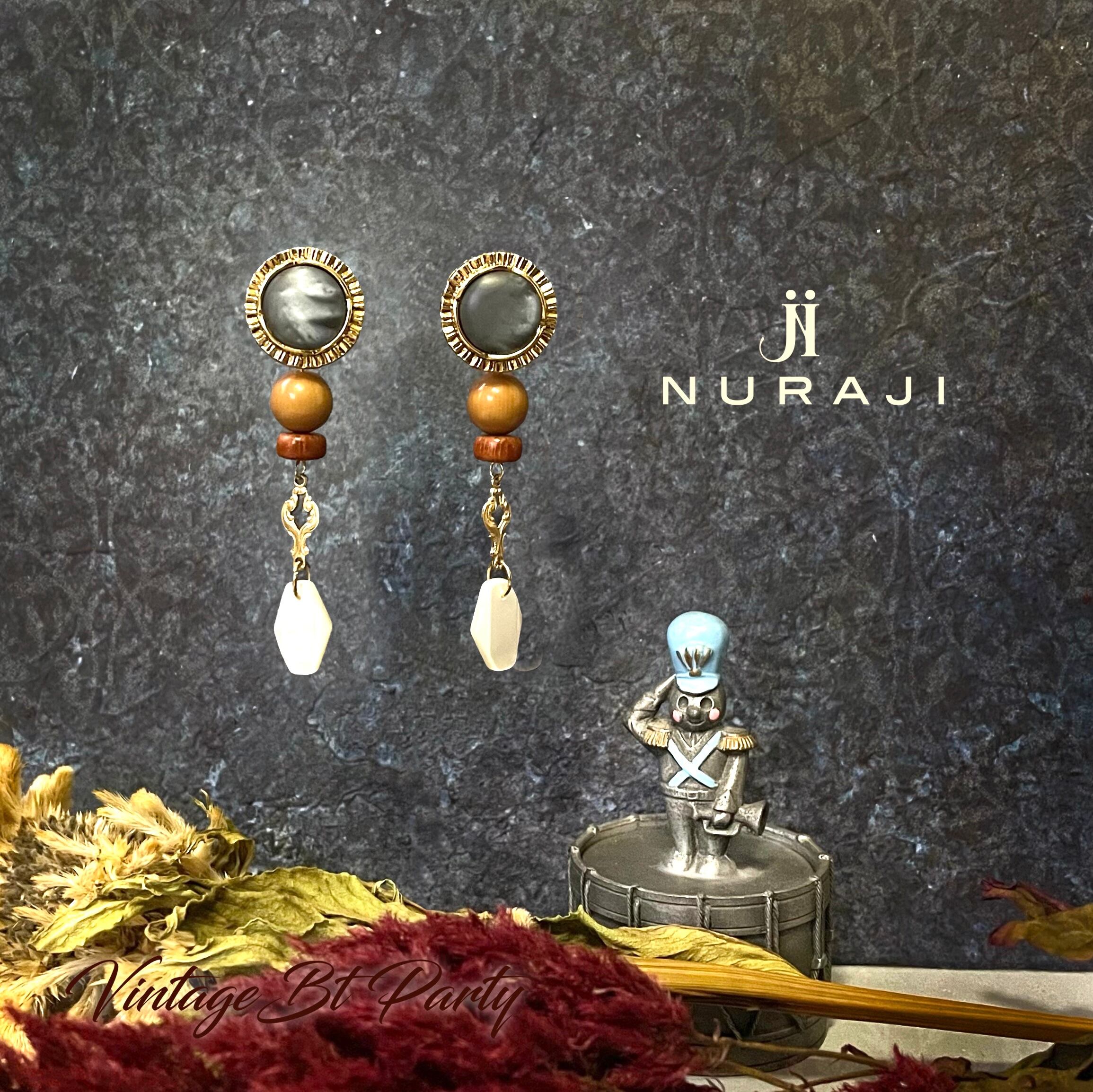 ブルーグレーボタンとシェルボタンの2種類のヴィンテージボタンを使用したピアスです。