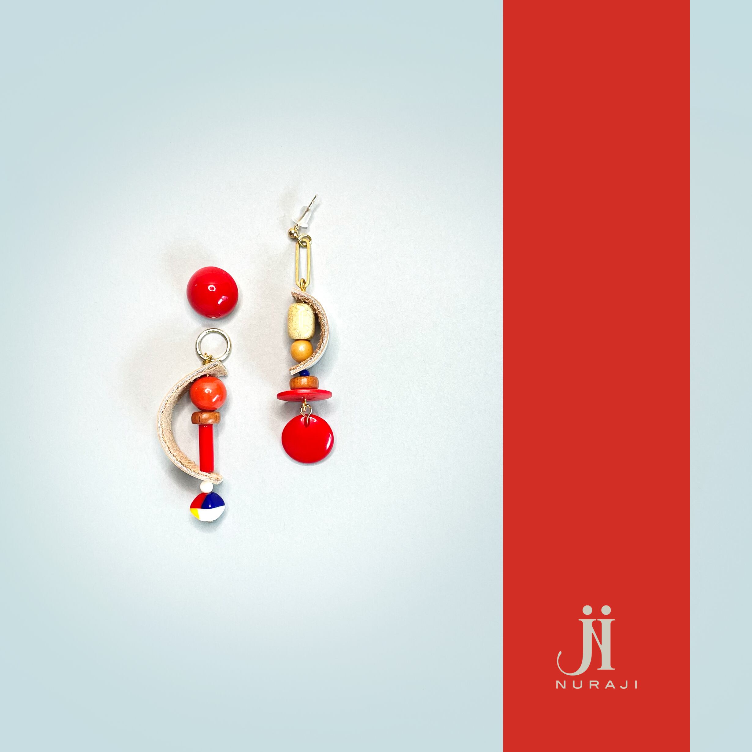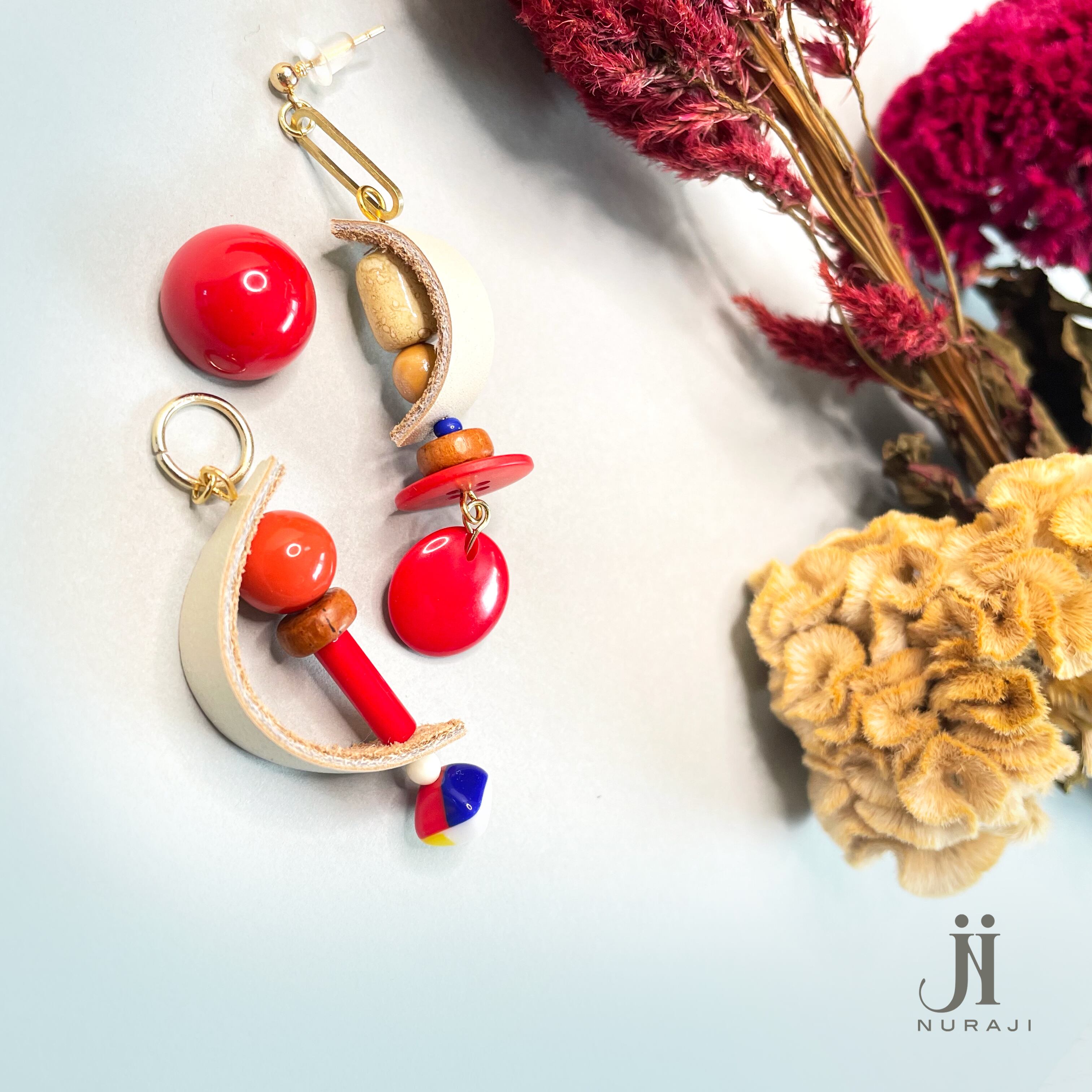 赤のレトロボタンとレザーが特徴のアシメデザイン。