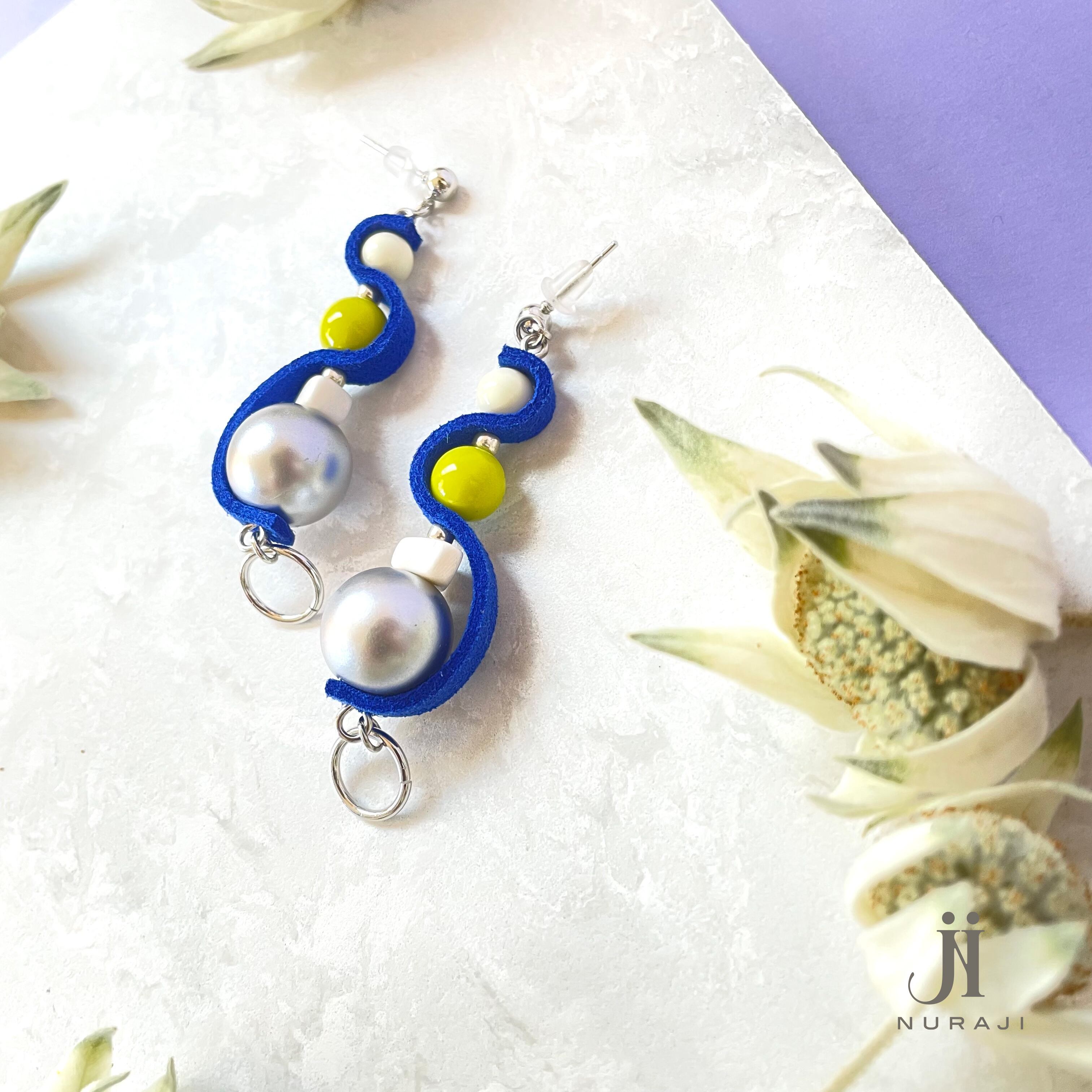 ポイントとなるロイヤルブルーの細スエードのくねくねが