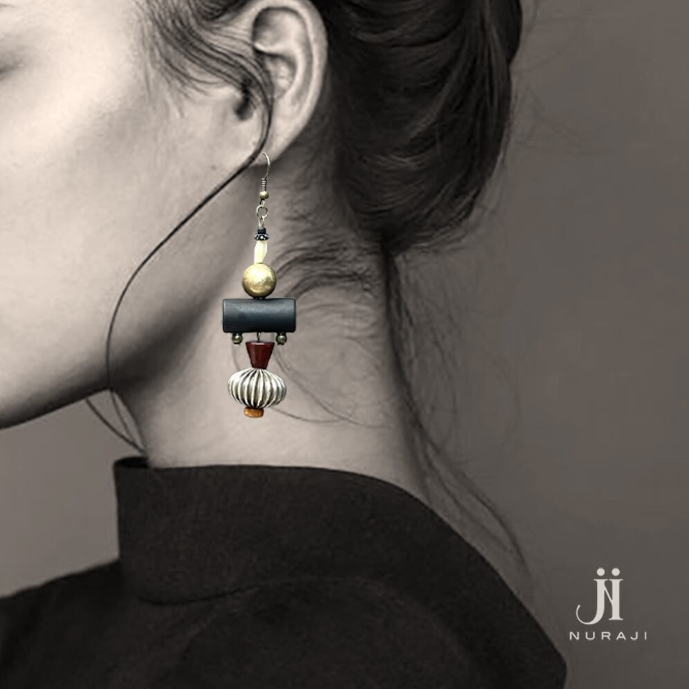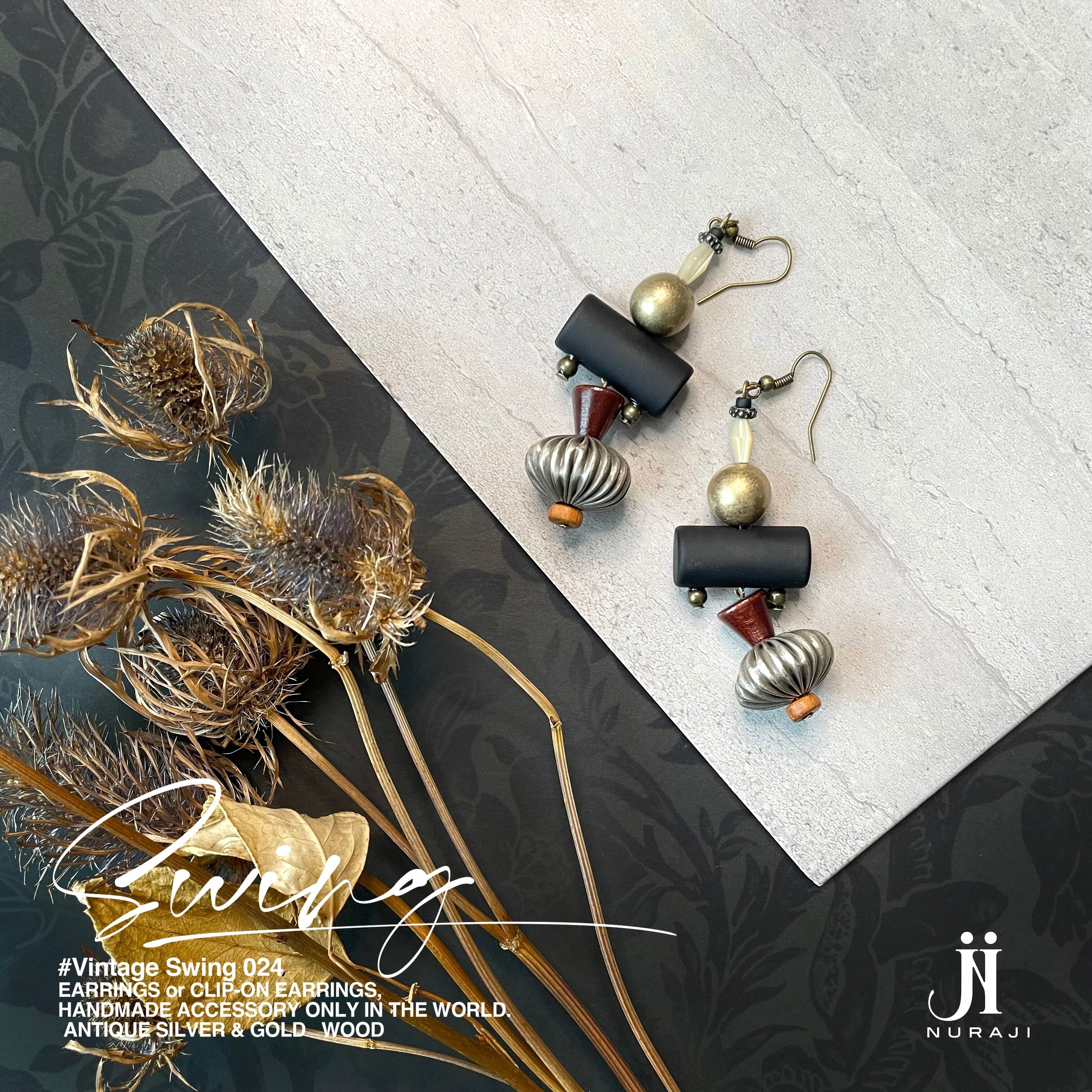 アンティークゴールド、アンティークシルバー、マットブラック、真鍮と2種のウッドを使用した味のあるデザイン。